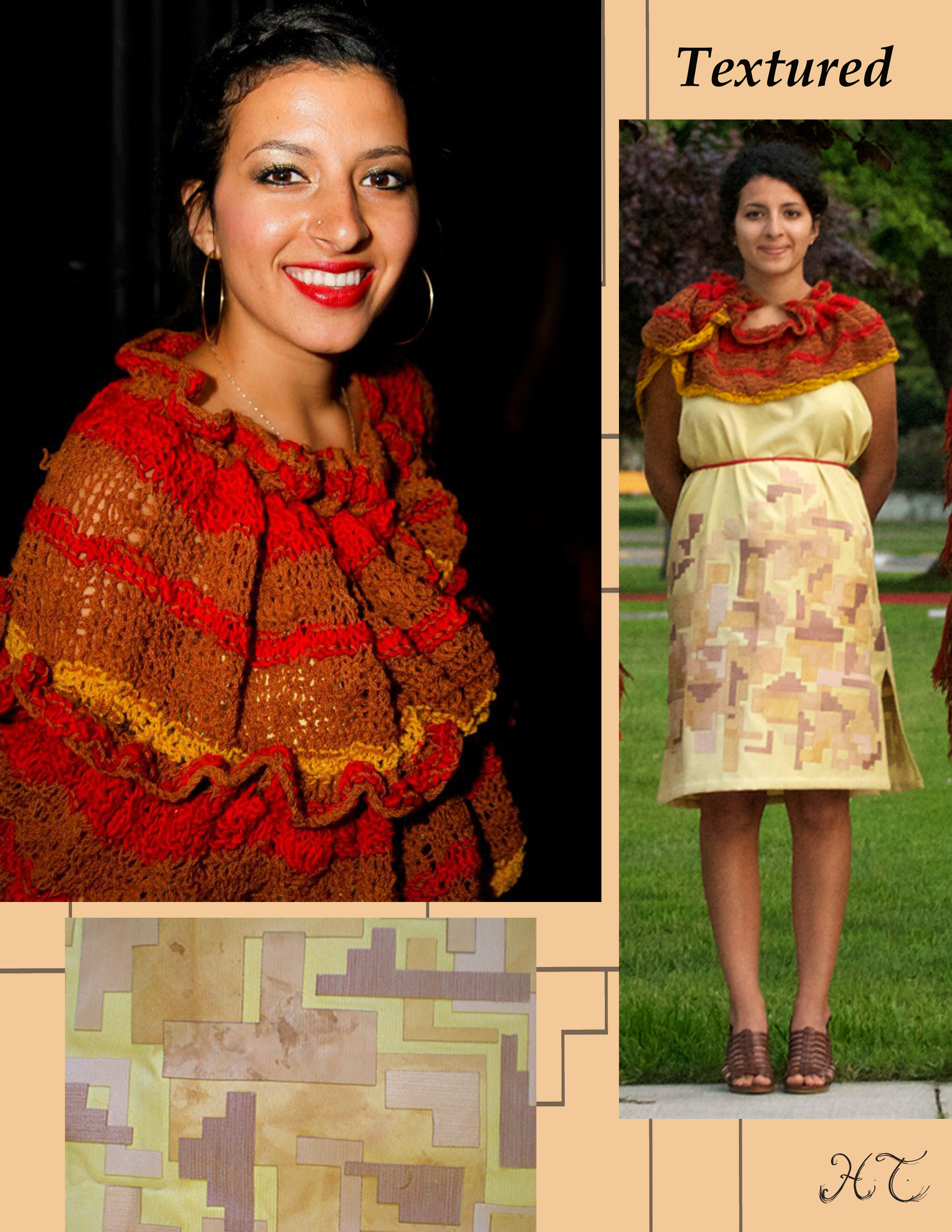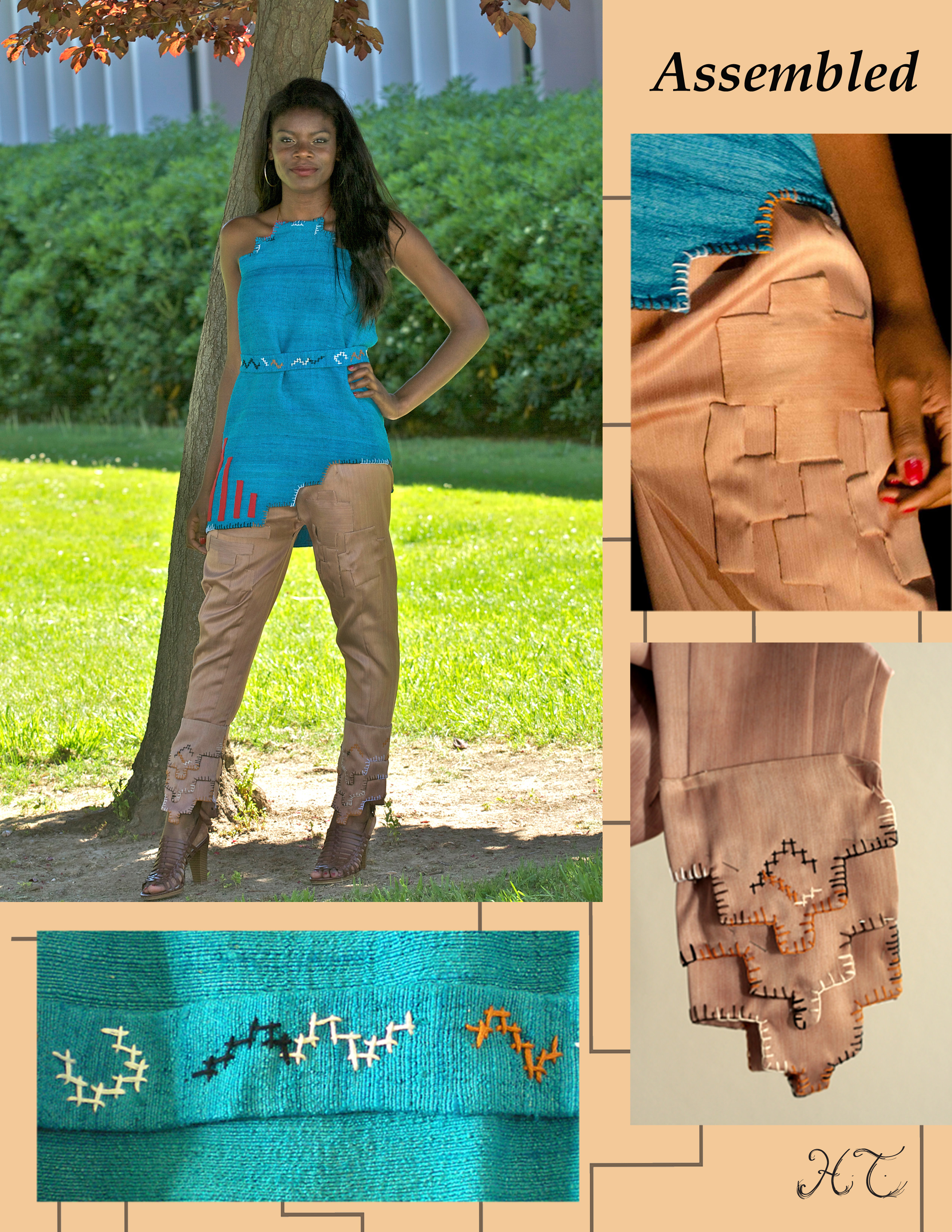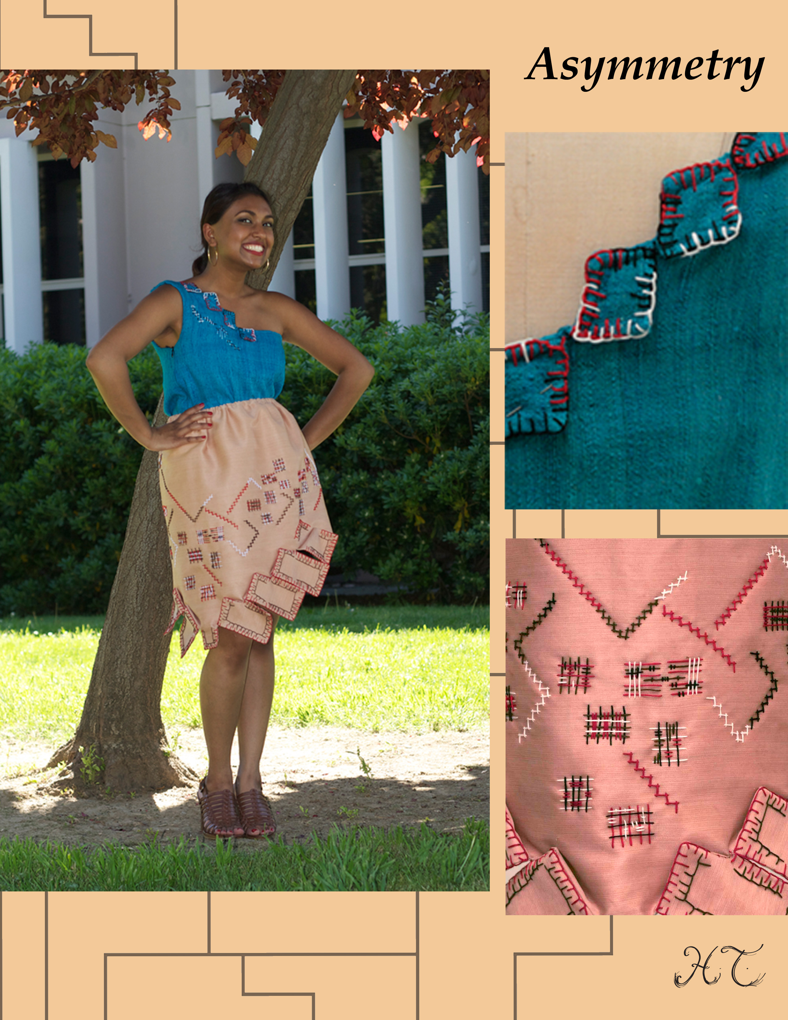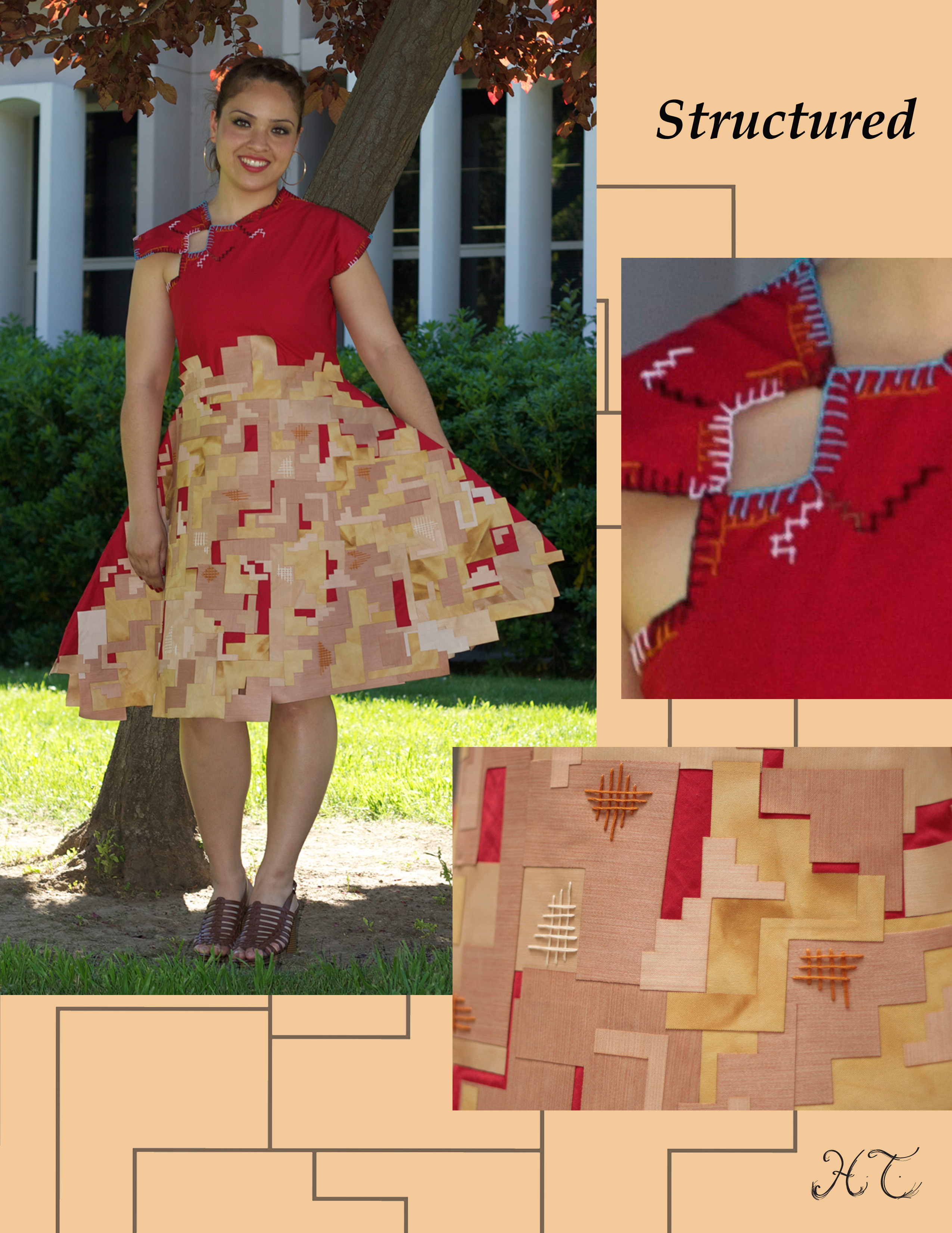 My zero-waste collection was inspired by sentimental architecture, which is the home my father built for my family in Los Angeles. I chose a home as the basis of my inspiration because a home and clothes function as protective shelter from the environment. Brick stair steps, a curvilinear staircase, and windows are all inspirational details. I integrate excess post-consumer fabrics as well as polyester from recycled PET plastic bottles. I added value to these textiles with hand-embroidery, applique, color staining, and laser cut manipulations. My unique collection shows how the sentimental value and prolonged life we give to a home may be applied to clothing, encouraging stronger emotional attachment and prolonged use. I used the cut-and-sew “jig-saw” zero-waste technique. This zero-waste conceptual and practice-based approach can lead towards an overall reduction of textile waste that can benefit the environment in the long term.