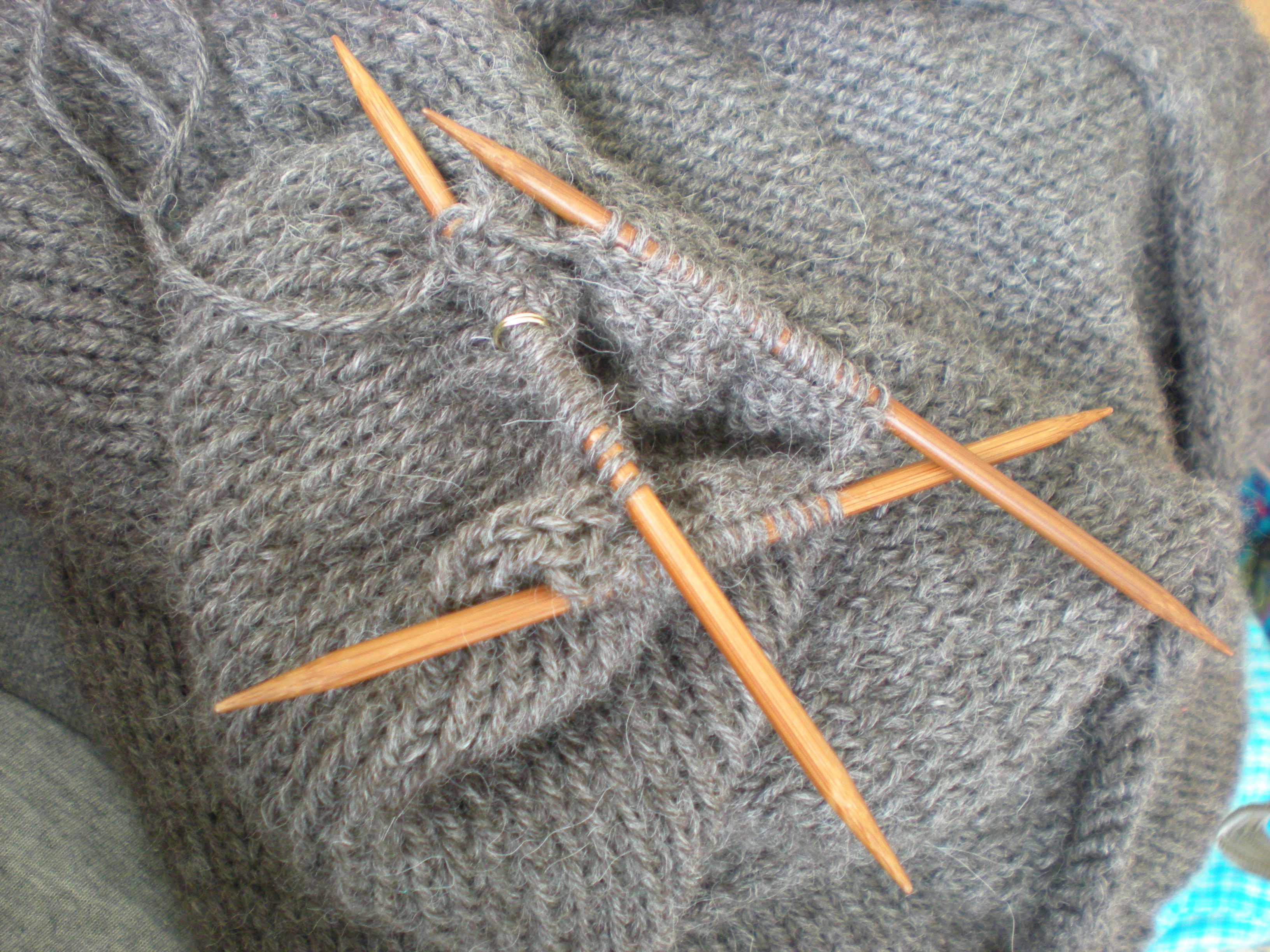 I was excited to see that there are knitting classes offered at Knitting Etc. in the Triphammer Mall in Ithaca. I think that the small community setting, and value given to hand-crafts in local stores throughout the Commons really inspired me to pursue knowledge about hand-crafted knitting clothing. I met with the knitting instructor additional times out of class to get extra help and avoid mistakes. Through this experience I learned that I do not do the knit stitch in the convention manner, and add an extra twist that can make the fabric appear more textured. I also learned what knitting in the round means with circular needles for the body, and by using several double pointed needles to form the sleeves. One of my favorite parts was learning how to do the special stitches for the center panel that include the twisted knit that are the protruding ribs along the sides, and the cable design along the center of the sweater front.