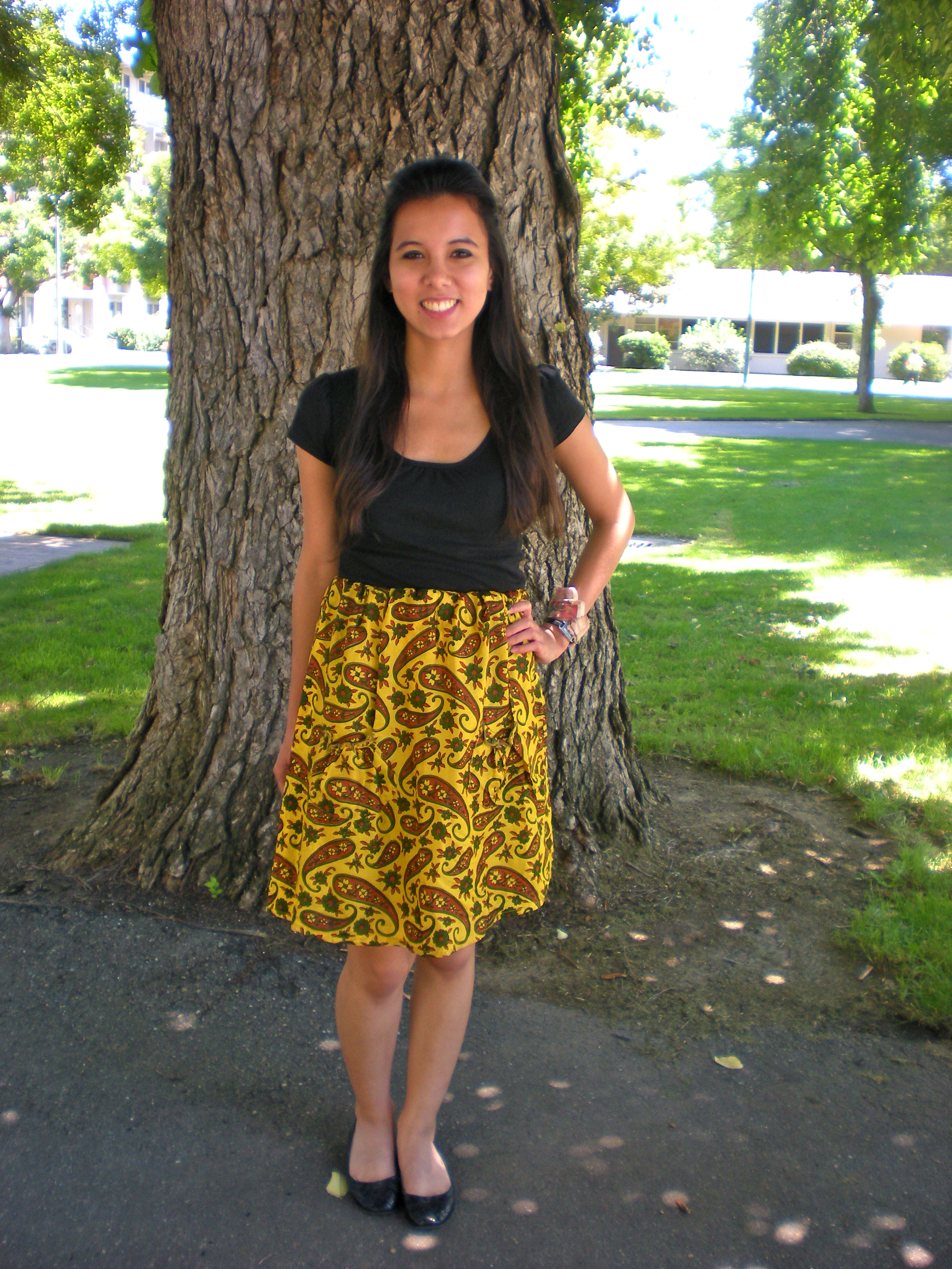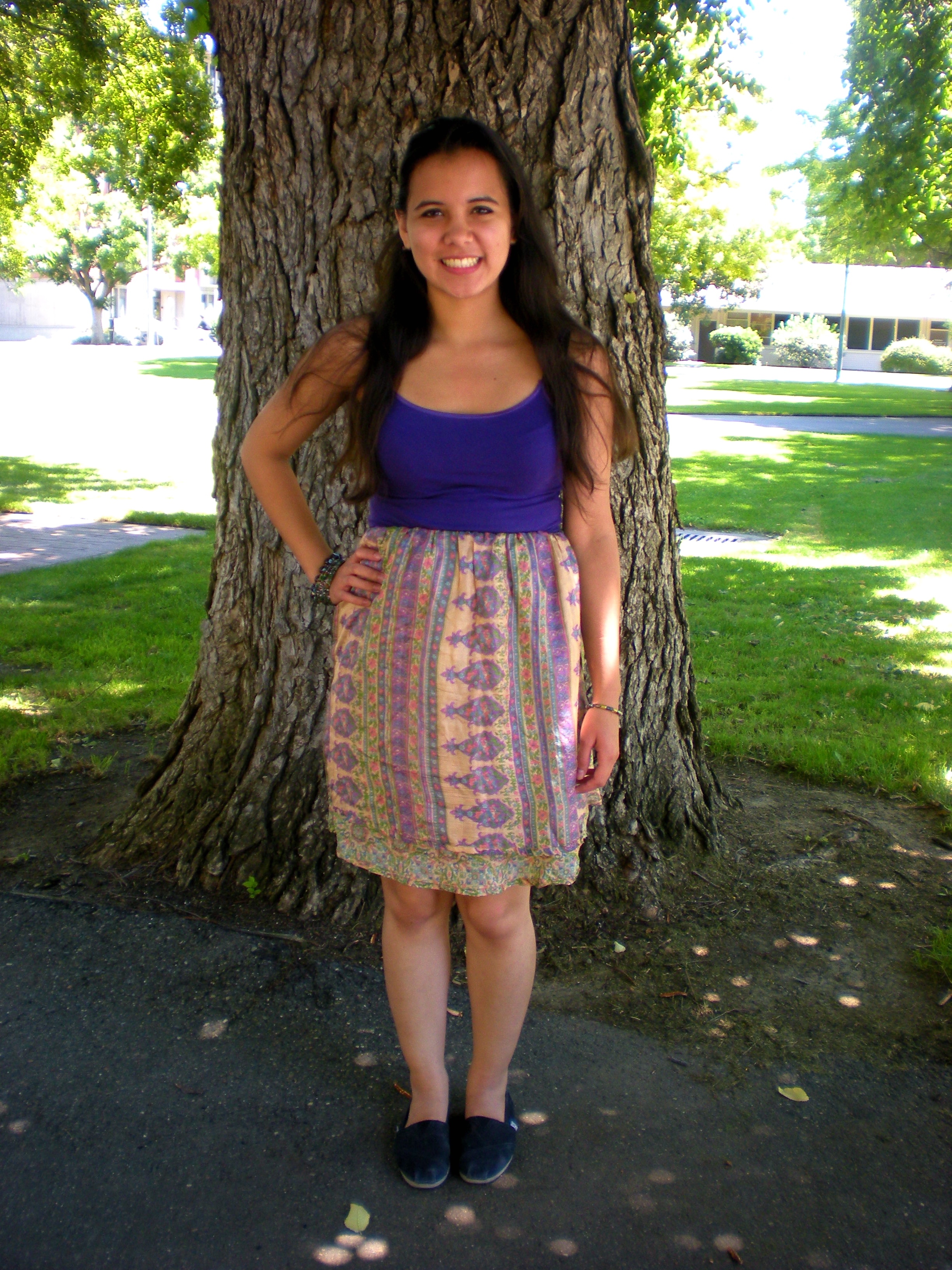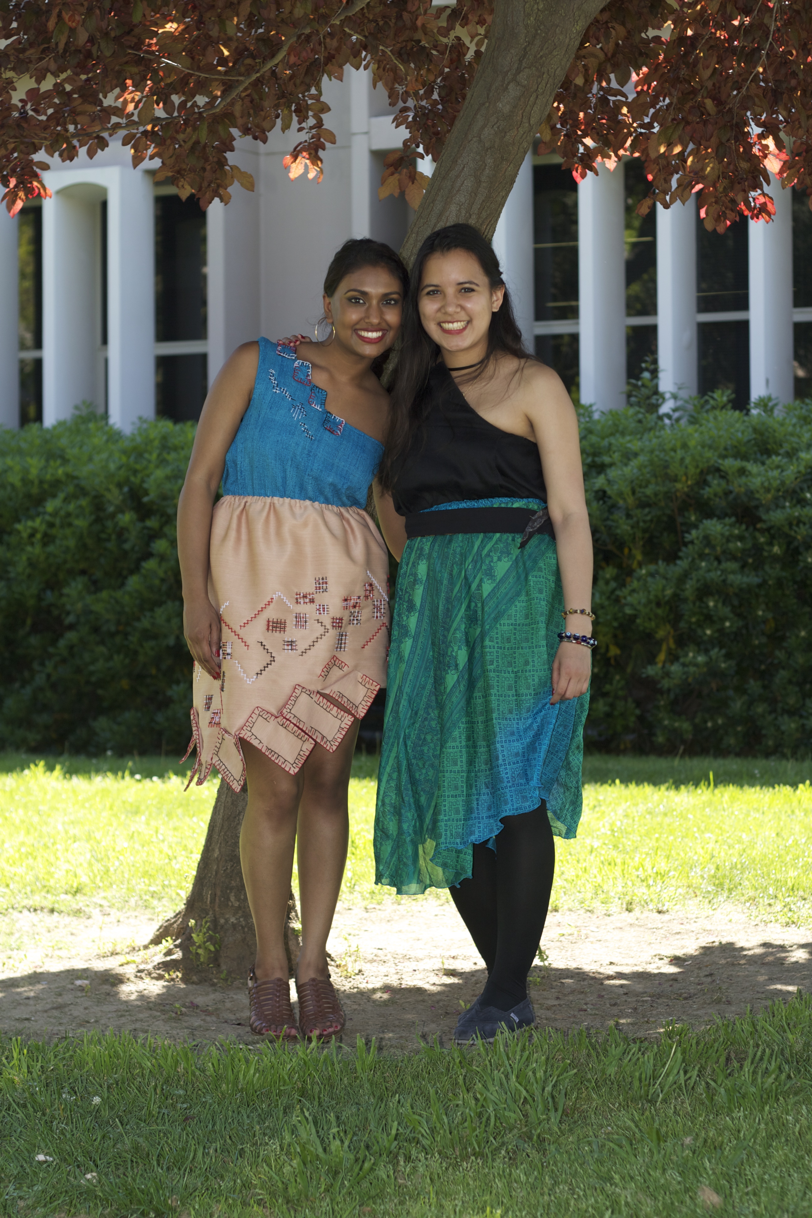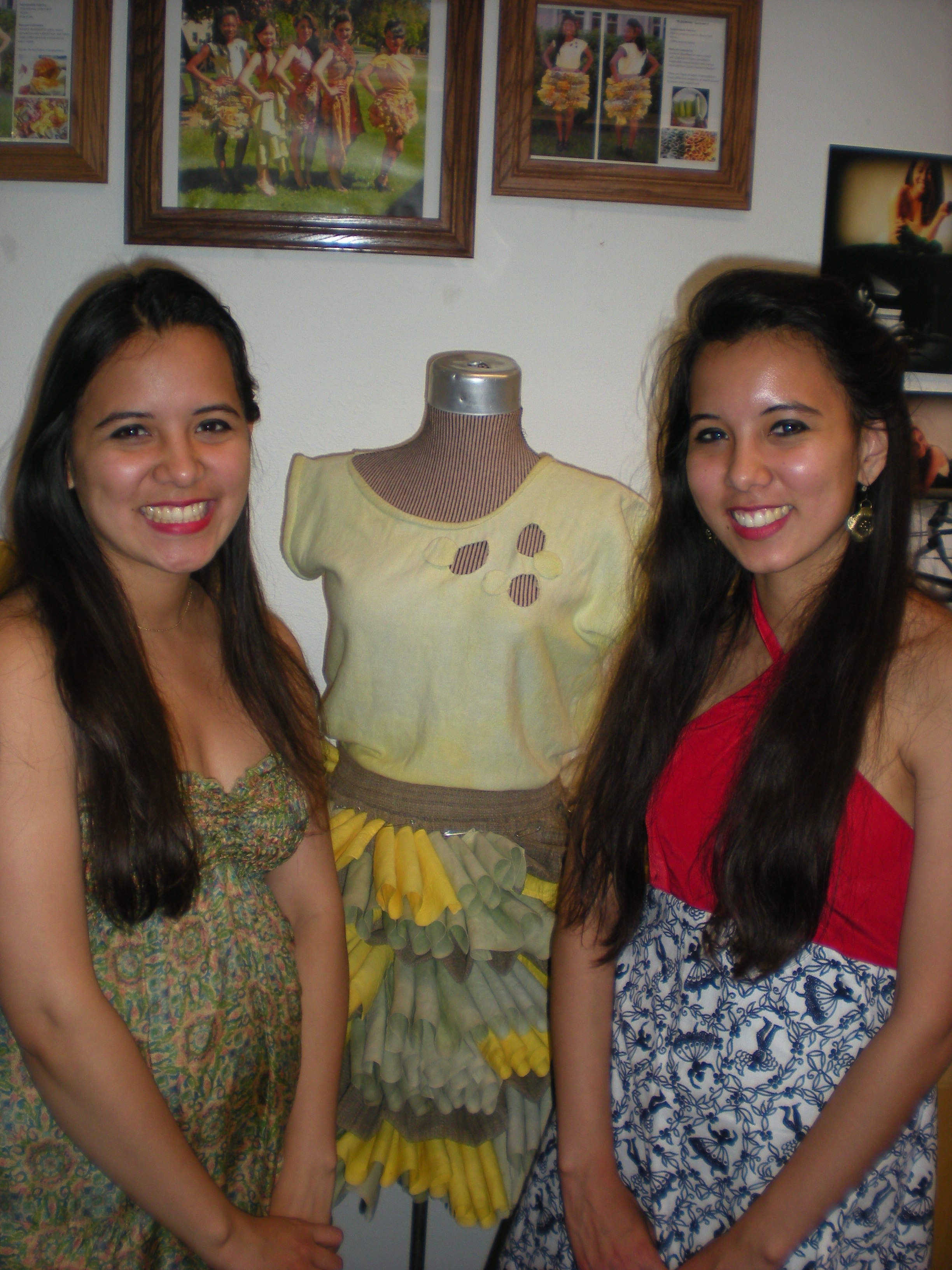 This was one of the first dresses my sister bought from Audrey in Spring 2009. She loved the purple/ pink color combination and the dynamism of the dress that was reflected in the fluid movement and design. She was excited to wear it to a special Fraternity event—May 2009My sister was strongly attracted to the paisley design that we learned about in our Eastern textiles design class. She turned the dress into a skirt on this day by folding the top section down. I took this picture for her McNair Scholars profile, and she also submitted this photo to the American Association of Textile Chemists and Colorists when they featured her in an article—July 2011I also turned one of Audrey’s dresses into a skirt by folding the top section down. The skirt is actually the lining of the original dress. The second layer was what convinced me to buy the dress because it was different from the outside and I loved the patterning. Wearing this dress at this time was special to me because later in the day I was sitting on a bench and saw my soon to be boyfriend, David, riding his bike and he stopped to talk to me. It was the second time we saw each other and I remember feeling nervous about my outfit. Since it was silk, I was sitting, and it was hot, I thought my skirt would be very wrinkled. But he complimented it and I stopped worrying about the wrinkles—July 2011This was one of the first dresses I bought from Audrey in Spring 2009. I was very exited to wear it to the Arboretum with David. We were sitting on a dock and he was helping me get up. At this point I was trying to finish my senior collection and I was really stressed out, it was nice to take time to think of which dress I wanted to wear to go to the Arboretum for a short break. I like how this dress was able to act as a stress-reliever when I really needed it—March 2012This is David’s sister, Cynthia. I was also happy that I was hugged and felt loved by people I really care about while wearing this dress—March 2012.This photo was taken at the beginning of the Signature Collections fashion show at UC Davis. Even though everything leading up to this day was extremely stressful, this was the moment where I would debut my zero-waste collection along with my fellow classmates and their creative collections. I invited Audrey to the show and was very excited to see that she came with her mom. She looked for me at the end of the show and gave me a warm hug and congratulated me. She also noticed that I was wearing one of her dresses. I was happy that she noticed I was wearing one of her dresses on that special day—April 2012Audrey’s work was extremely influential in developing my interest in sustainable fashion design. This is one of my favorite photos because I am wearing one of Audrey’s dresses alongside my own zero-waste designs from my collection. I am also with a great friend who was also my model, Jessica Dutt—April 2012I love this dress (left) because the print has a lot of cute details that can lead a person to look closer to appreciate the design. It is the original dress from the July 2011 photo. It also has pockets, which was very convenient to me. I wore this to an Art Gallery opening where my sister exhibited her senior collection where she used natural colorants—May 2012My sister is wearing a dress given to her by Audrey in Spring 2012. She wore it to the Textiles & Clothing end of the year reception where she got awards for her undergraduate research and accomplishments in textile science. She really liked the inverted triangle because it is an interesting design detail. Nidia was also excited to add her hand-made crochet accessory to contribute her own creativity to the outfit—June 2012Audrey gave me this dress in Spring 2012 and I was so excited to wear it. I loved the unique colors- orange and lavender- the slight sheen, and the creative cut. The dress is so unique and interesting, it was perfect to wear for my graduation—June 2012I am wearing Audrey’s dress under my graduation gown! I am glad that the dress was able to be a part of that special day—June 2012