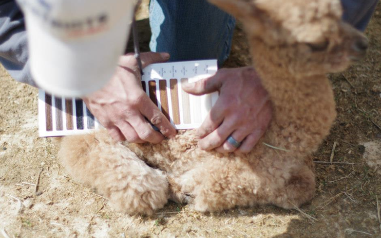 Farmers also take time to determine fiber quality of their beloved fiber animals. In the photograph below, the farmer is trying to match the baby alpaca’s fiber color to a standard set of colors by the Alpaca industry. Ideally, the color would match one of the standard 22 shades and be uniform. This would allow for the consistent production of alpaca yarns for mass-produced clothes.