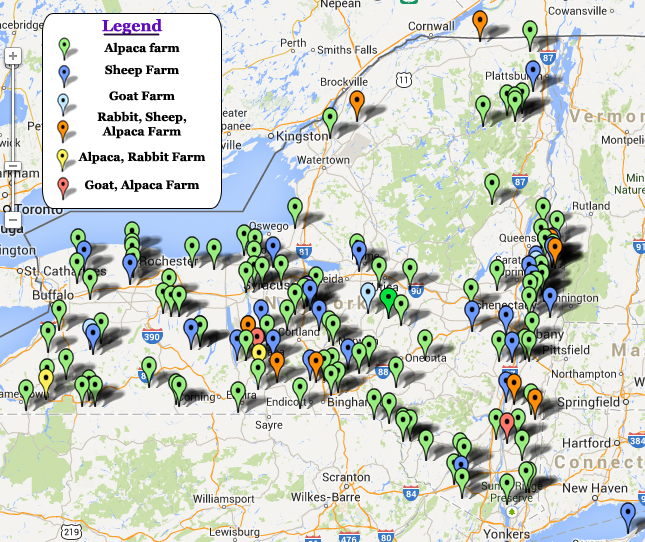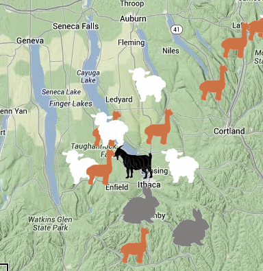 There are a diversity of fiber farms throughout New York that include sheep, alpaca, goats, angora rabbits, and llamas. The map below conveys the fiber farms that neighbor the Fingerlakes.
