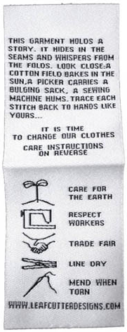 Including information about production processes, environmental, and social responsibility is one way companies are giving greater value to care labels. Below we see examples of care tags created by Leafcutter Designs in California.
