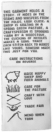 These labels can be purchased individually by people who make individual, one-of-a-kind garments, or in bulk by large companies. Integrating this information into the care label is a shift beyond just providing information about appropriate laundering. It acknowledges the “care” attributed in making clothing.