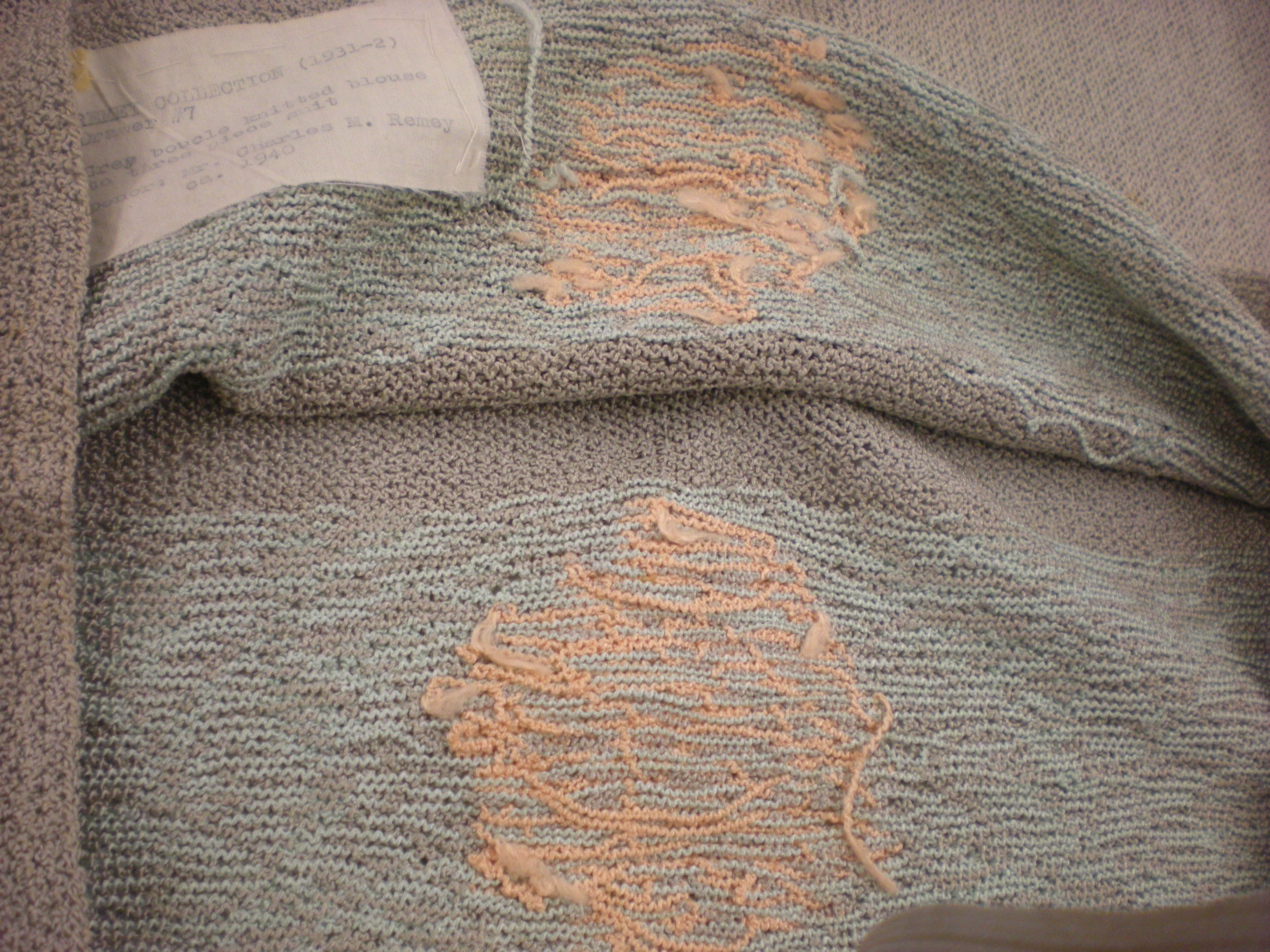 This is an interior view of the floating wefts that create the floral motifs on the blouse. There are a few snagged weft yarns, but this is expected when there are long wefts. It is amazing to see Jacquard designs at this time. The major knit machinery manufacturer, STOLL in Germany, developed their first motor driven Jacquard machine in 1926. The results seen in this knitwear conveys the success of knitwear technology at a time when it was developing.