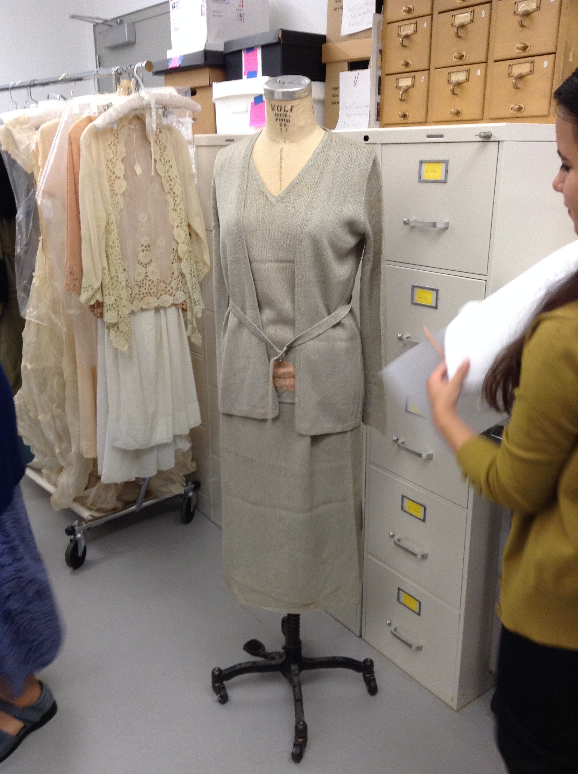Mrs. Remey’s 3 piece ensemble on a dress form in the Costume Collection