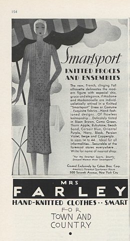 Below are Vogue advertisements that prompted Americans to purchase the latest 3-piece suit knitwear. “Smartsport” was a leading knitwear brand in the United States, and Cohen Bros. was a large knitwear manufacturer during the 1930s.