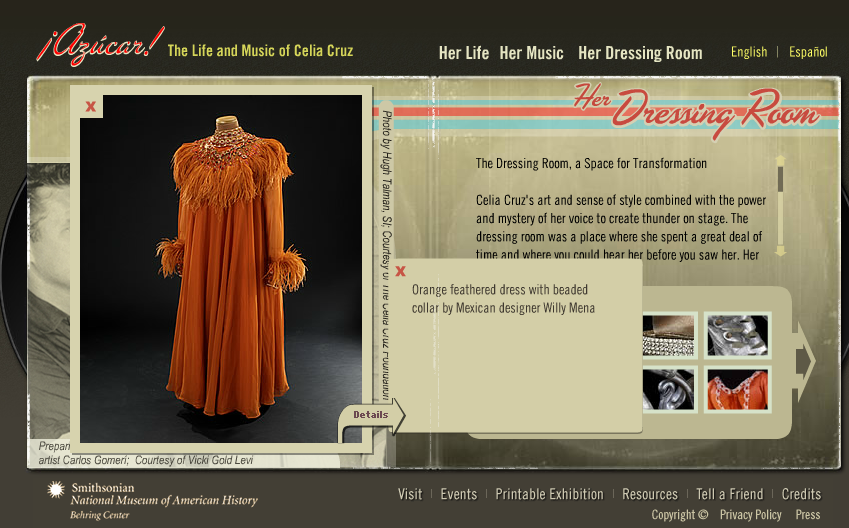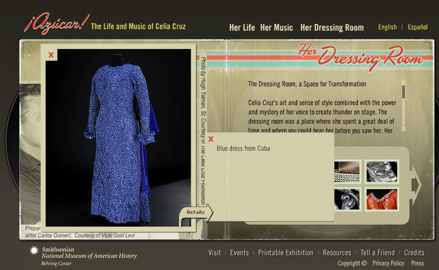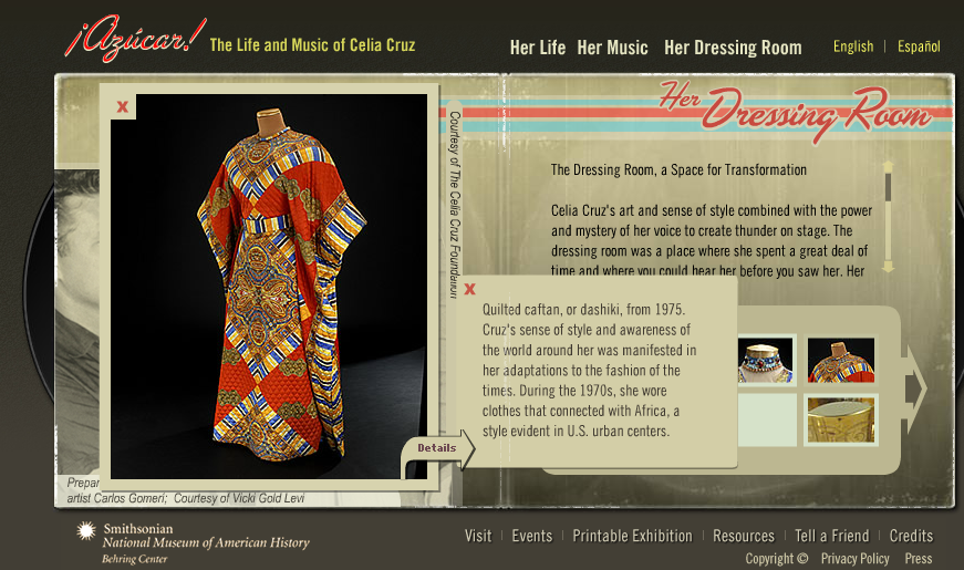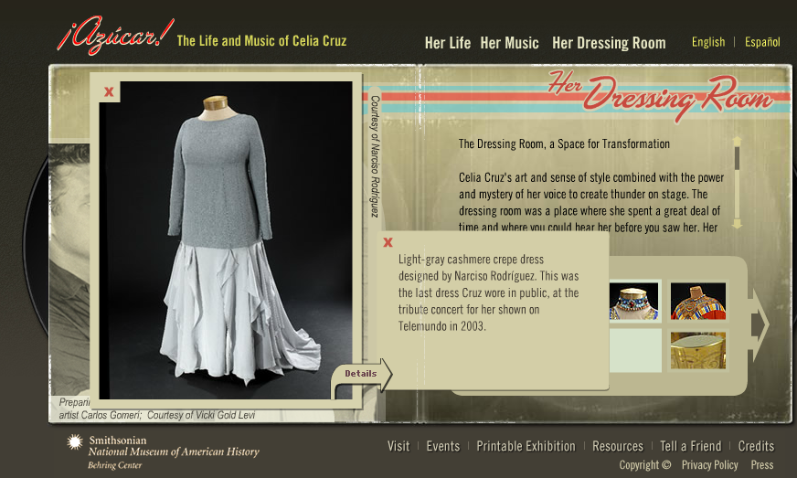 Celia Cruz is certainly a fashion icon and I was excited to find images of her clothing in the Smithsonian Museum of American History. In the “Dressing Room” section, her costumes and accessories are regarded as representative of her “voice, style, music, love, and deep religiosity.”