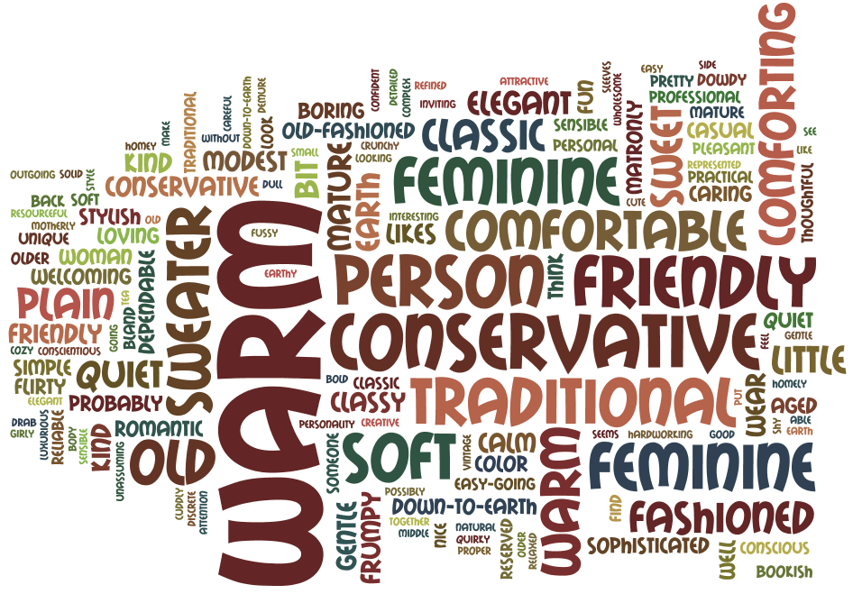 I was excited to make this word cloud that represents personality descriptions of hand-knit sweaters (cashmere, alpaca, wool). It is based on responses from 200 women in New York.