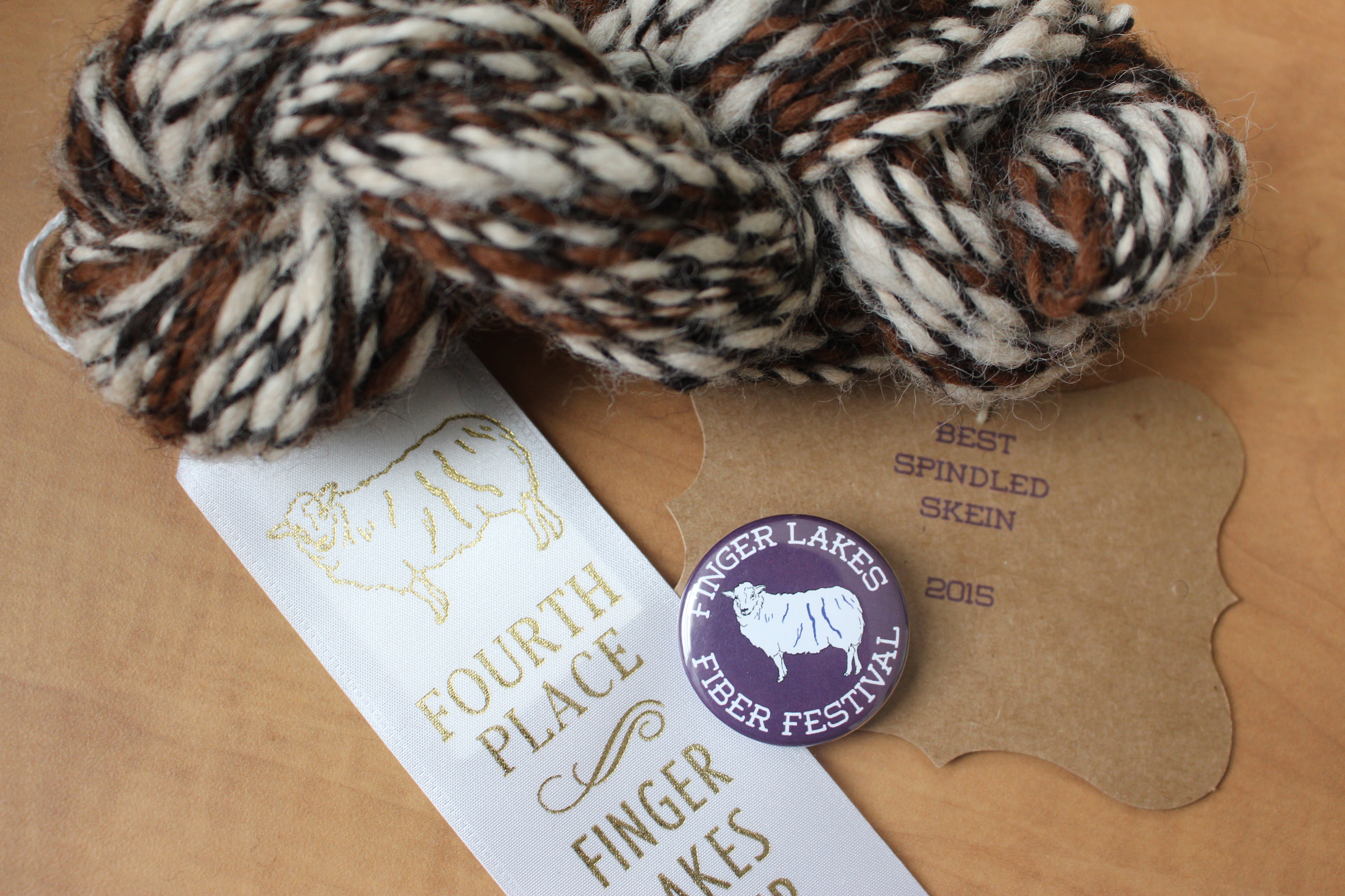 IMG_2496I also entered a skein of hand-spun alpaca fibers and received a ribbon and FLFF button. Even though I got “Best Spindled Skein,” I have a lot to improve on, especially with making my singles and plying consistent.