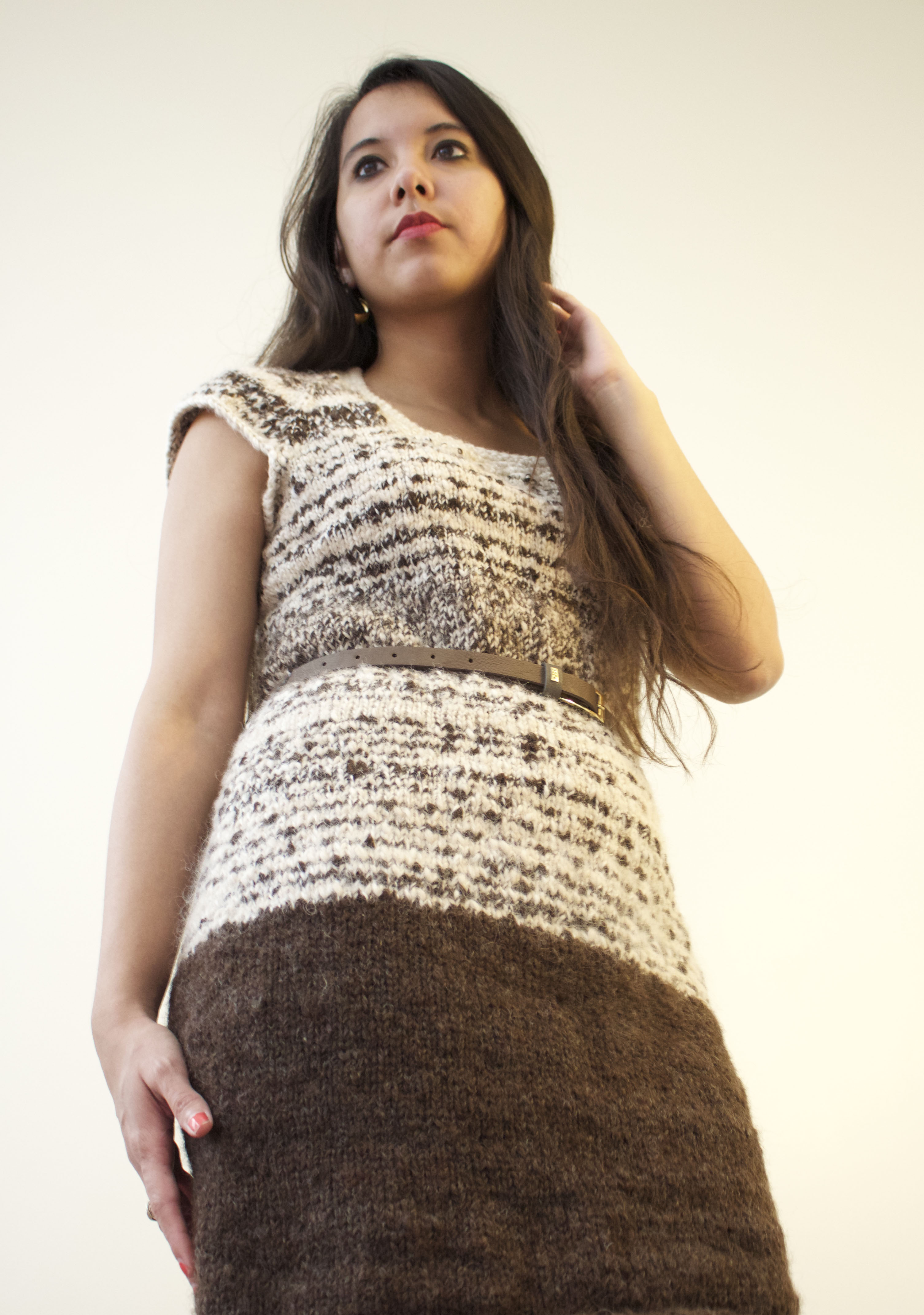 My last step will be to felt the lower portion of the dress that is made of Romney wool. I want to take advantage of the fact that the brown portion is 100% wool compared to all other parts of the dress that are blended with alpaca fibers. (I tried to felt a knitted sample of wool/ alpaca blended yarns, but it didn’t work).