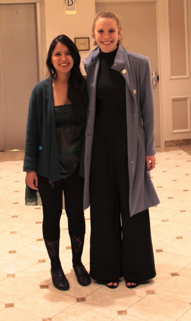 The goal behind her award-winning outfit was to create a timeless design. This is reflected with her use of black and light blue tones. She used commercial patterns from Vogue and Butterick and chose to focus on current trends such as a knee length coat and wide pant legs. The coat is made of wool fabric produced by Pendleton in the U.S. She received it for her participation in a previous MIWW competition. The coat is lined with silk that was hand-dyed with black beans. The black jumpsuit is made of a wool and spandex blend from Sawyer Brook.