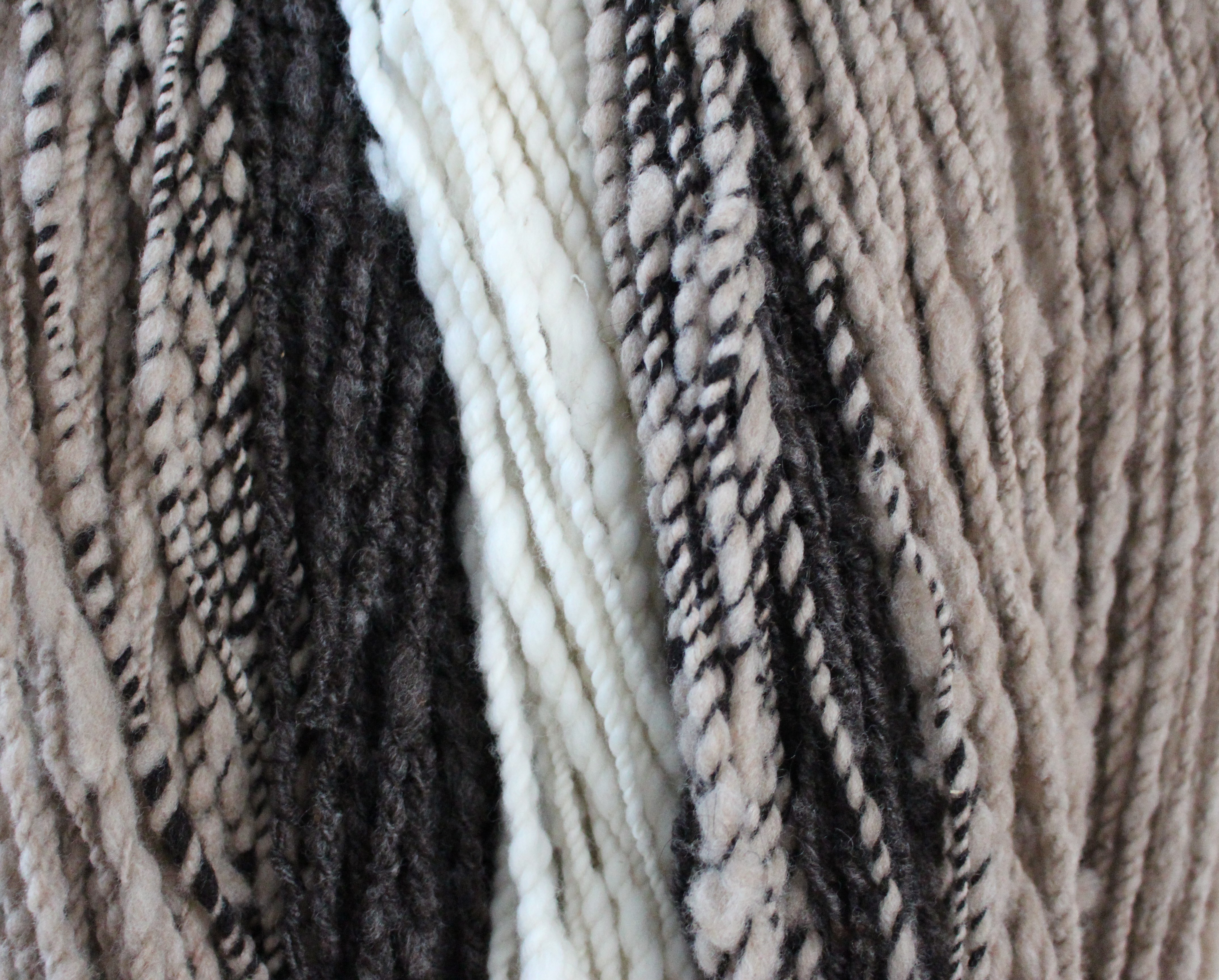 My main goal when spinning the yarn was to make it as consistent as possible in terms of thickness. While spinning the different colors of yarn – white, black, grey, and brown – I noticed small differences during the process in the way that the fibers spun together. The white wool, which was from the Merino sheep, was the easiest to spin as the fibers were more flexible when pulling them apart so that the yarn could be a consistent thickness. On the other hand, this ease of flexibility also meant that the fibers would break more easily, so I had to connect the fibers more frequently during the spinning process. This could be attributed to the characteristics of Merino wool being one of the finest wool fibers. In comparison, the Navajo Churro wool was the coarsest, and most difficult to pull apart during the spinning process.