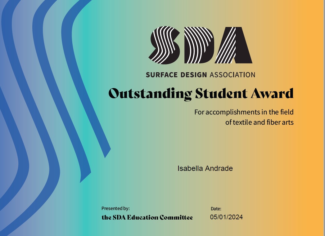 By Spring 2024, I spun over 20 yards of wool yarns, which were displayed at the LA County Fair for nomination under the Home Arts Award. I placed third in the category of hand-spun yarns. Additionally, my professor and mentor, Dr. Trejo nominated me for the Surface Design Association Outstanding Student Award. This award was for my extensive work with yarn spinning that contributed towards the textiles developed during 2023 and 2024. I received a certificate of recognition.